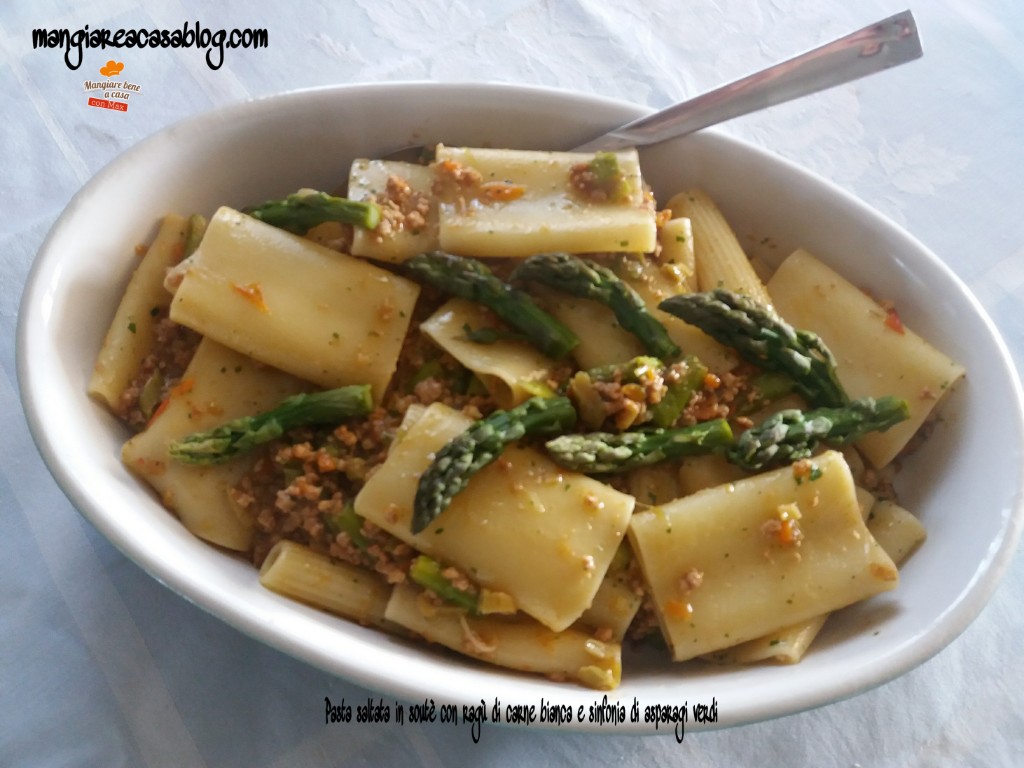 Pasta saltata in soutè con ragù di carne bianca e sinfonia di asparagi verdi