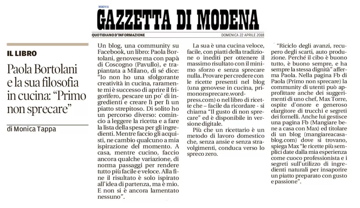 Con grande entusiasmo e soddisfazione per la segnalazione, ringrazio Paola per la collaborazione ed opportunità di partecipare al suo stimolante blog: primononsprecare.wordpress.com. Ci aiuta ad utilizzare il prezioso cibo in tutte le sue parti eliminando notevolmente lo spreco.
