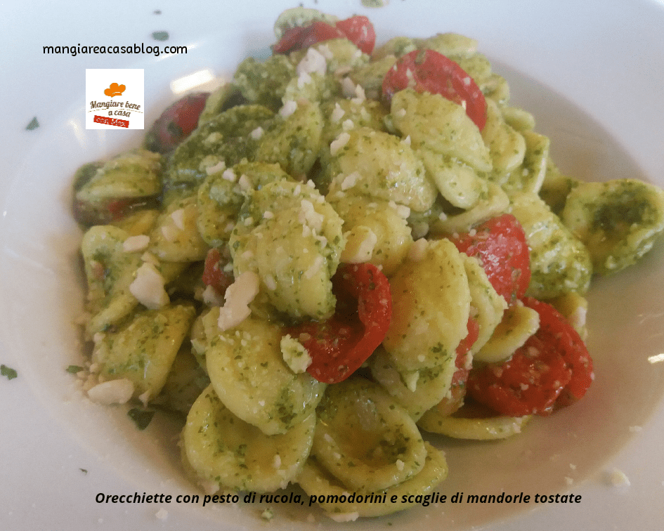 Orecchiette con pesto di rucola, pomodorini e scaglie di mandorle tostate