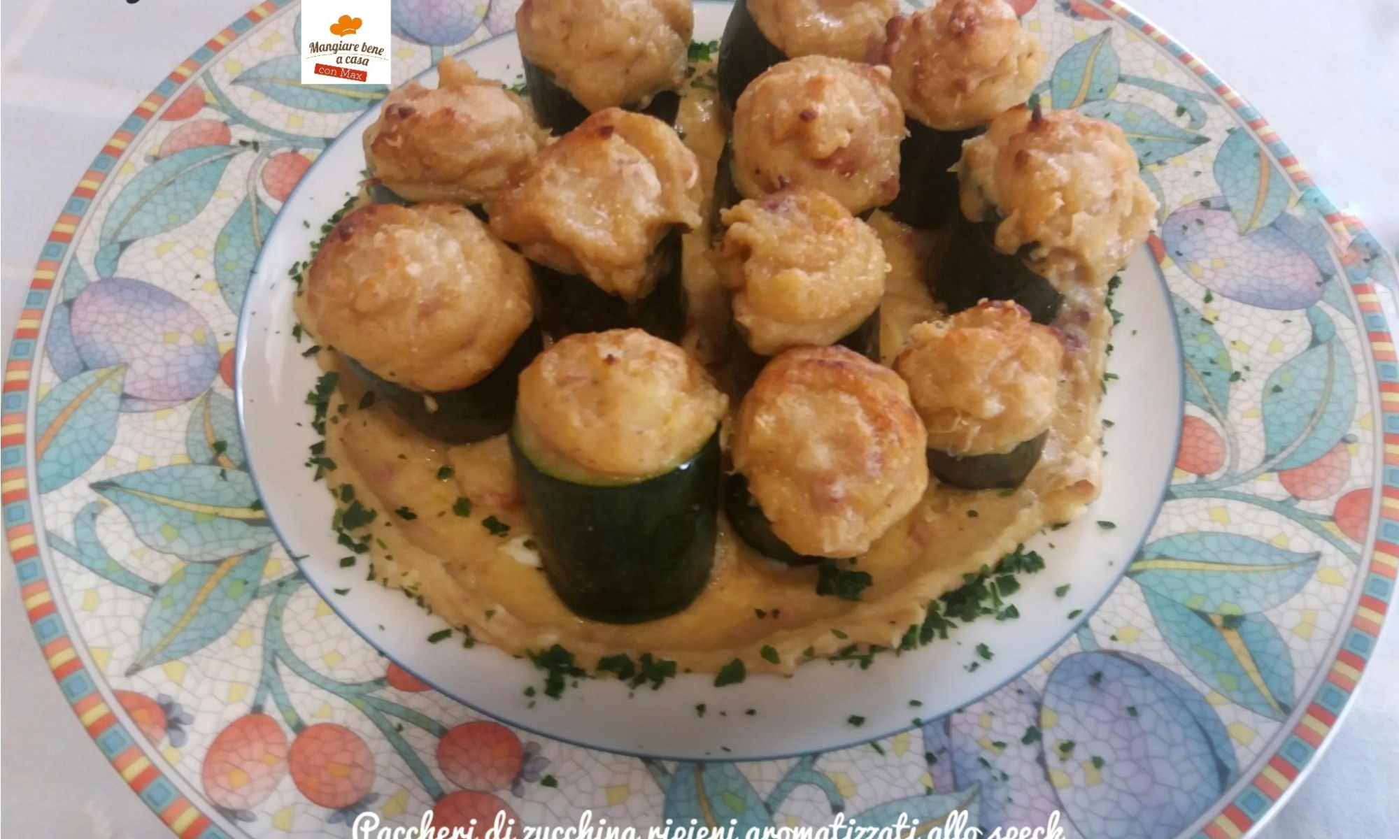 Buongiorno amici, questa ricetta è totalmente inventata da me, nata dall'idea di creare la forma dei paccheri utilizzando questo ortaggio farcito. Il ripieno è composto da patate e polpa di zucchina insaporito con porro e aromatizzato con lo speck. Dopo la gratinatura in forno, il risultato è strepitoso che regala al palato un sapore appetitoso e intenso ma, allo stesso tempo, molto delicato. Una ricetta che può essere servita tiepida, calda o a temperatura ambiente, come antipasto oppure secondo piatto.