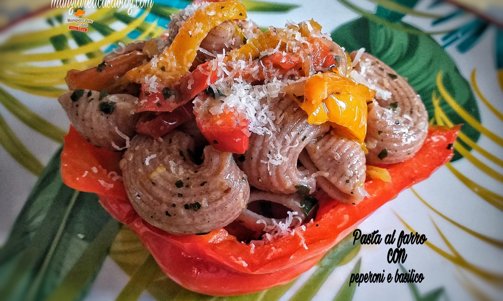 Pasta al farro con peperoni e basilico fresco