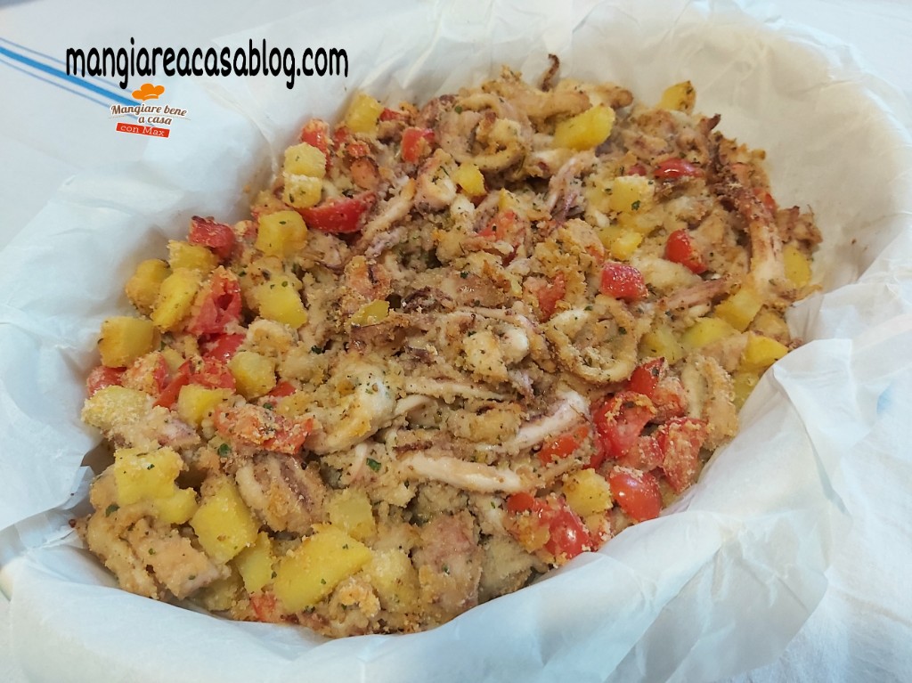 - Condite con olio all’aglio, prezzemolo, sale, pepe e origano, mescolate bene, aggiungete pomodorini, patate, pangrattato e mescolate amalgamando tutto assieme. Disponete il composto in una pirofila rivestita con carta oleata, passate in forno pre riscaldato a 190°C per circa 20 minuti e servite.