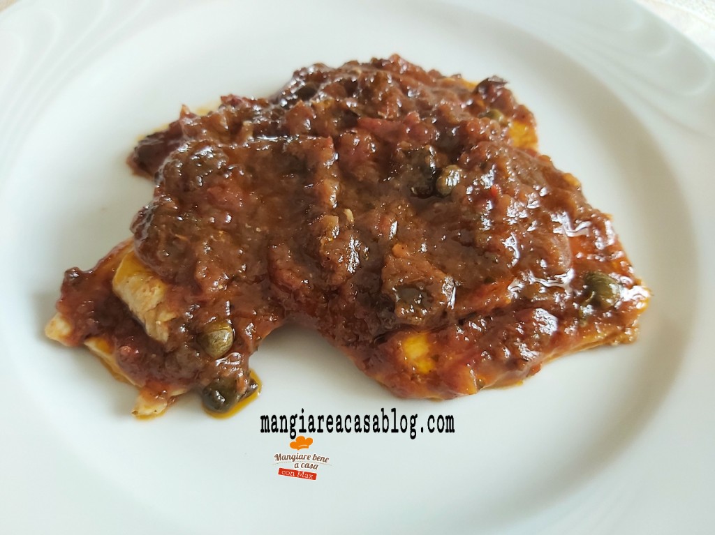 - Scaldate 2 cucchiai di olio all’aglio in un tegame, unite i pomodori, sale, pepe e fate cuocere a fiamma medio bassa fino a che saranno ammorbiditi, unite i capperi, le olive e il basilico tritato;