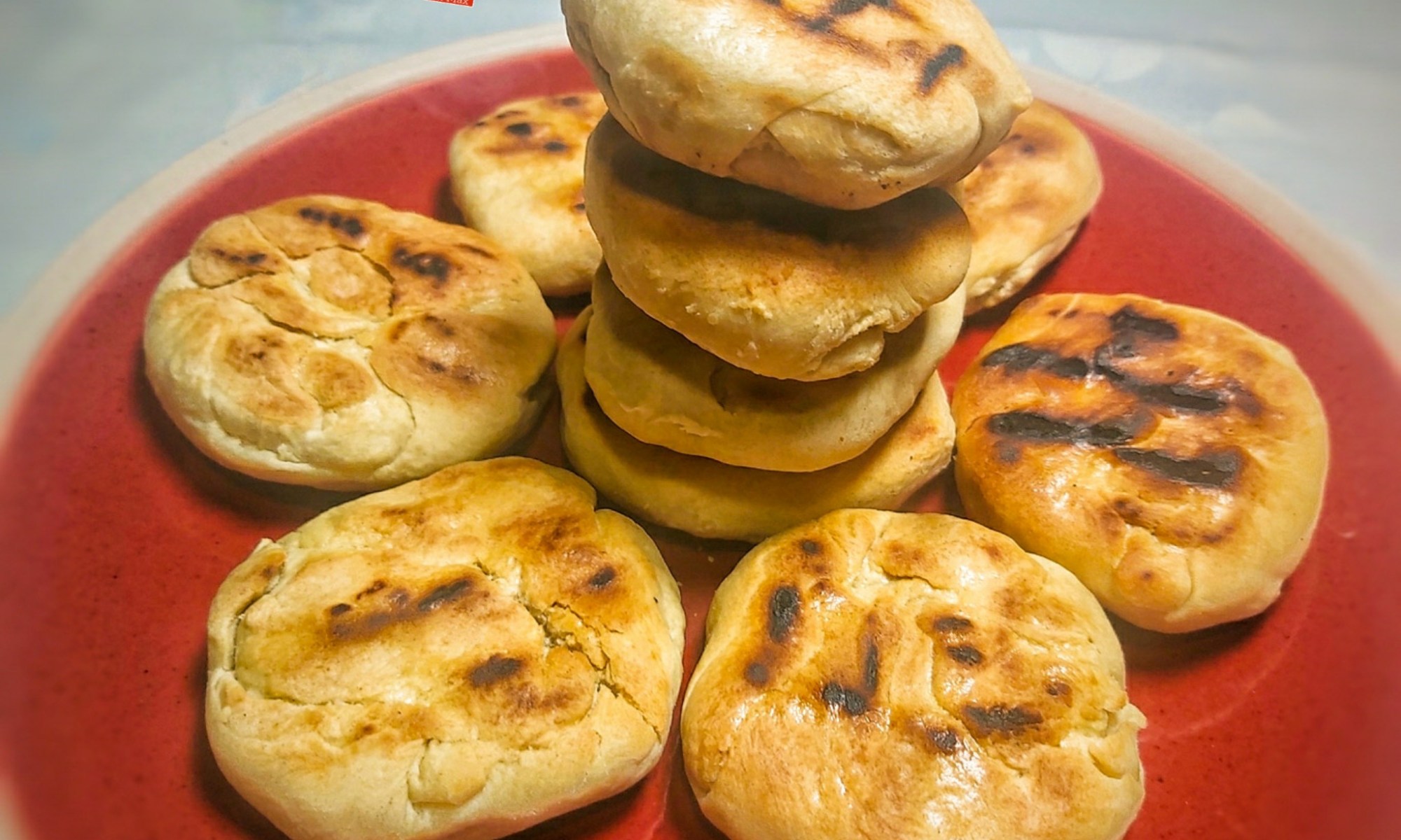 4. Appiattire le palline con le dita fino ad ottenere dei dischetti spessi, larghi circa 5 cm e cuoceteli per circa 7/8 minuti per lato su una piastra in ghisa ben calda;