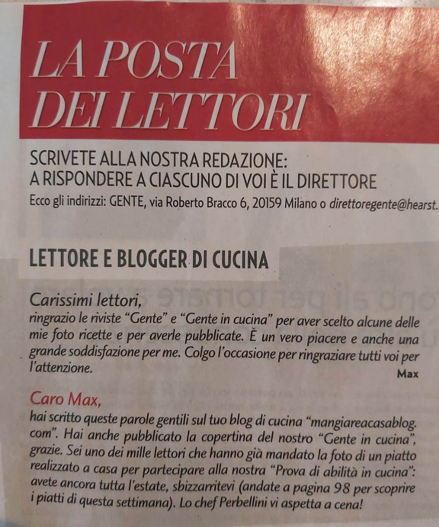 Buongiorno carissimi lettori, ringrazio la rivista Gente e Gente in cucina per aver scelto alcune delle mie foto ricette che sono state pubblicate su alcuni dei loro settimanali. Un vero piacere e soddisfazione da parte mia. Colgo l’occasione per ringraziare tutti voi per l’attenzione.