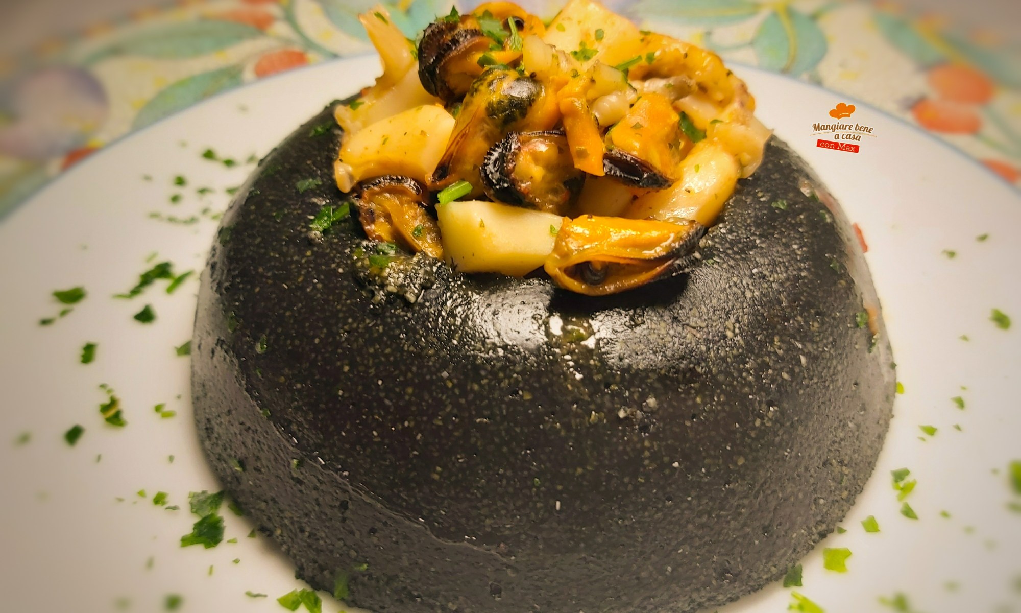 Ciambella di polenta al nero di seppia con cozze e seppie in tegame