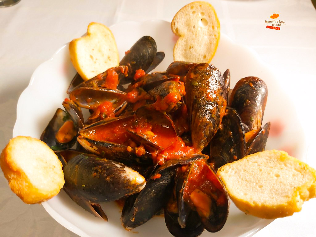 Cozze al pomodoro con crostoni di pane