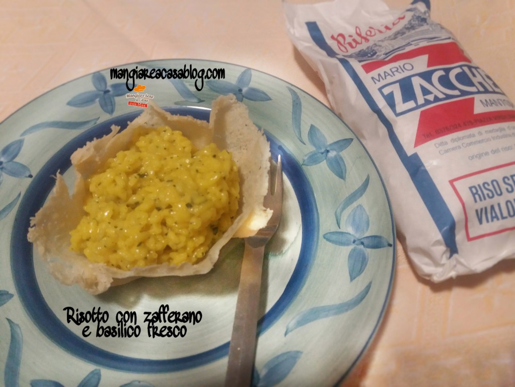 Vi parlo di questo risotto molto gustoso, realizzato con il riso Zacchè, che profuma gradevolmente di basilico fresco. Due ingredienti che si abbinano tra loro: lo zafferano e l'intensità del basilico che dona a questa ricetta un sapore molto gradevole. Io ho scelto di servirlo in coppette realizzate con dell' ottimo parmigiano.